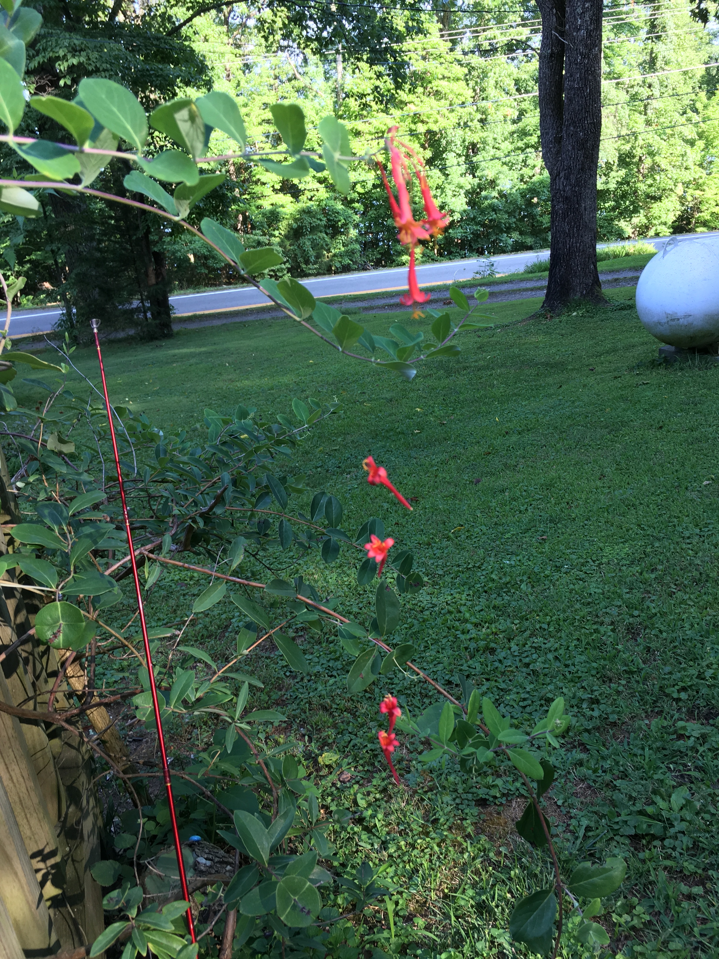 This is the dainty little strand of jewels that a spider left me the other day from scarlet honeysuckle blossoms.